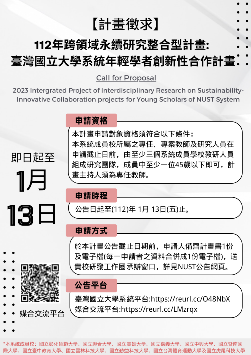 「跨領域永續研究整合型計畫:臺灣國立大學系統年輕學者創新性合作計畫補助計畫書(格式)」(如附件2)